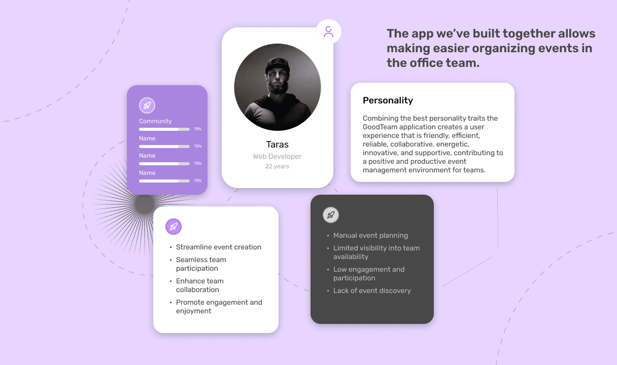Overall, the GoodTeam application embodies a friendly, efficient, reliable, collaborative, energetic, innovative, and supportive personality, fostering a positive and productive event management environment for teams.
